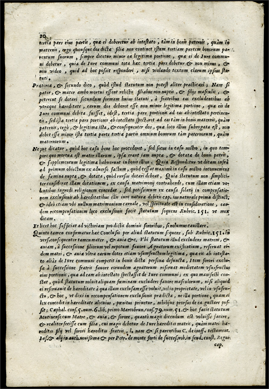 Responsa diuersorum super statutis Mutinae exclusiuis foeminarum, in quibus latissimè examinatur quaestio illa, an filiae exclusae à successione matris stantib. masculis debeatur dos de bonis maternis, non obstante quod fuerit à fratre dotata in bonis paternis, ante mortem matris / [Giovanni Pietro Sordi, Sforza degli Oddi, Giacomo Menochio]. - [Modena? : Francesco Gadaldini?], 1595.