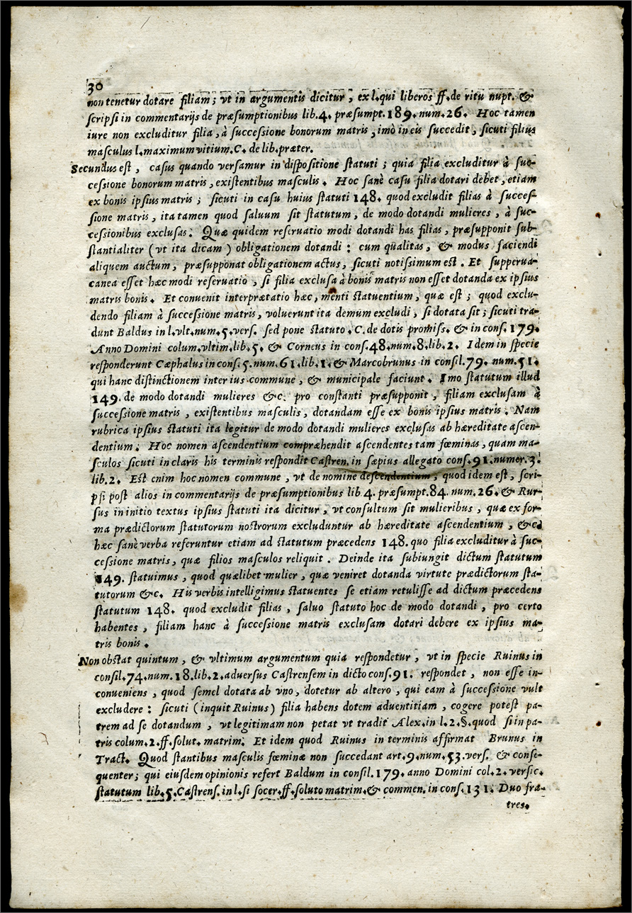 Responsa diuersorum super statutis Mutinae exclusiuis foeminarum, in quibus latissimè examinatur quaestio illa, an filiae exclusae à successione matris stantib. masculis debeatur dos de bonis maternis, non obstante quod fuerit à fratre dotata in bonis paternis, ante mortem matris / [Giovanni Pietro Sordi, Sforza degli Oddi, Giacomo Menochio]. - [Modena? : Francesco Gadaldini?], 1595.