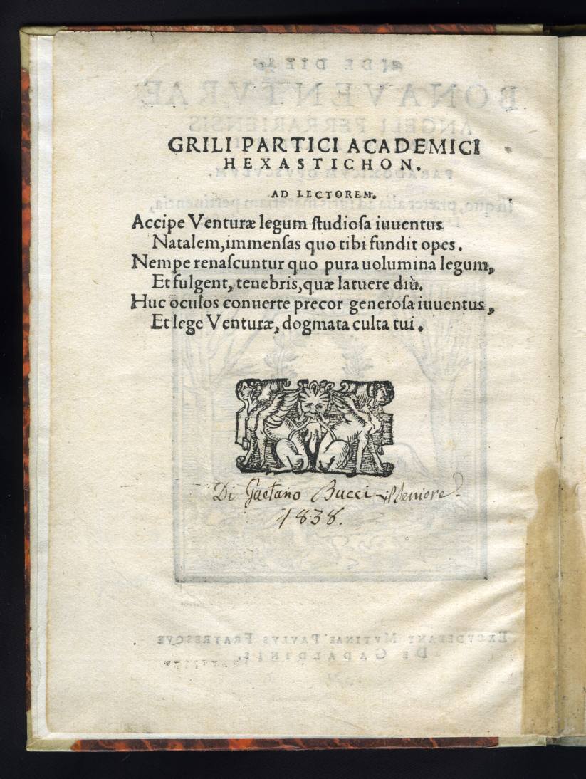 De die Bonauenturae Angeli Ferrariensi Partici Academici paradoxicum opusculum. In quo, praeter alia ad iuris materiam pertinentia, explicatur cuisque Lij ff. de verb. fig. -