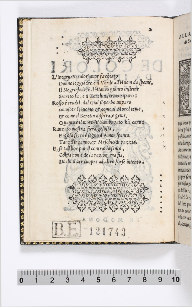 Il colore incarnato significa Amore. Cap. I. (p. 9-13); Il verde speranza. Cap. II. (p. 13-15); Il negro fede. Cap. III. (p. 15-18); Il bianco secreto. Cap. IIII. (p. 19-21); Turchino fermezza. Cap. V. (p. 22-24); Morello. Timore. Cap. VI. (p. 25-27); Berettino disperatione. Cap. VII. (p. 28-31); Rosso crudeltà. Cap. VIII. (p. 32-37); Giallo superbia. cap. VIIII. (p. 37-40); Verde sambugato uoglia di morire. Cap. X. (p. 41-43); Ranzato gelosia. Cap. XI. (p. 43-47); Meschio leggerezza. Cap. XII. (p. 47-50); Rosa secca amore finito. cap. XIII. (p. 50-54); Tanè, o leonato, tradimento, et inganno. Cap. XIIII. (p. 55-60) |