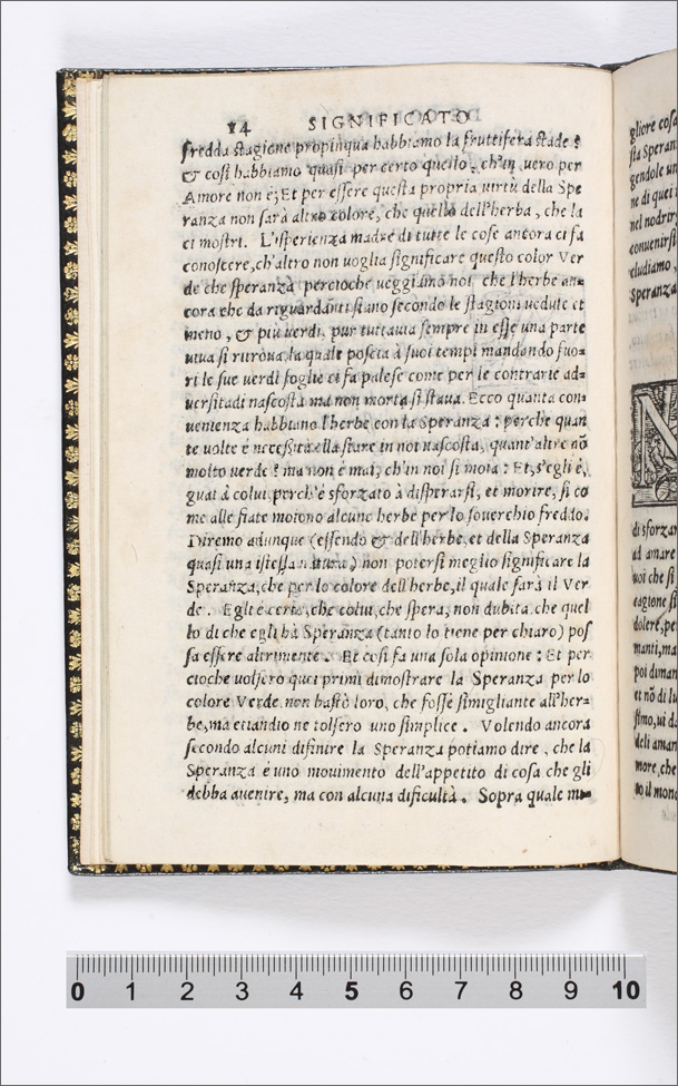 Il colore incarnato significa Amore. Cap. I. (p. 9-13); Il verde speranza. Cap. II. (p. 13-15); Il negro fede. Cap. III. (p. 15-18); Il bianco secreto. Cap. IIII. (p. 19-21); Turchino fermezza. Cap. V. (p. 22-24); Morello. Timore. Cap. VI. (p. 25-27); Berettino disperatione. Cap. VII. (p. 28-31); Rosso crudeltà. Cap. VIII. (p. 32-37); Giallo superbia. cap. VIIII. (p. 37-40); Verde sambugato uoglia di morire. Cap. X. (p. 41-43); Ranzato gelosia. Cap. XI. (p. 43-47); Meschio leggerezza. Cap. XII. (p. 47-50); Rosa secca amore finito. cap. XIII. (p. 50-54); Tanè, o leonato, tradimento, et inganno. Cap. XIIII. (p. 55-60) |