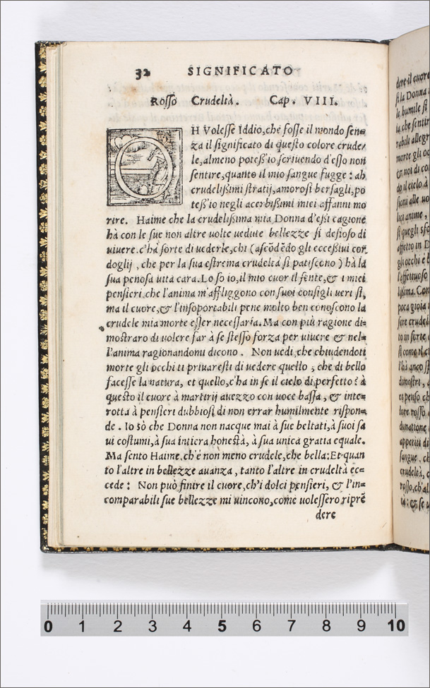Il colore incarnato significa Amore. Cap. I. (p. 9-13); Il verde speranza. Cap. II. (p. 13-15); Il negro fede. Cap. III. (p. 15-18); Il bianco secreto. Cap. IIII. (p. 19-21); Turchino fermezza. Cap. V. (p. 22-24); Morello. Timore. Cap. VI. (p. 25-27); Berettino disperatione. Cap. VII. (p. 28-31); Rosso crudeltà. Cap. VIII. (p. 32-37); Giallo superbia. cap. VIIII. (p. 37-40); Verde sambugato uoglia di morire. Cap. X. (p. 41-43); Ranzato gelosia. Cap. XI. (p. 43-47); Meschio leggerezza. Cap. XII. (p. 47-50); Rosa secca amore finito. cap. XIII. (p. 50-54); Tanè, o leonato, tradimento, et inganno. Cap. XIIII. (p. 55-60) |