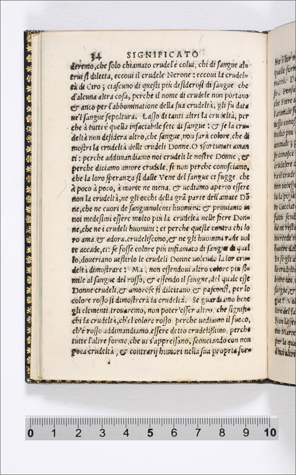 Il colore incarnato significa Amore. Cap. I. (p. 9-13); Il verde speranza. Cap. II. (p. 13-15); Il negro fede. Cap. III. (p. 15-18); Il bianco secreto. Cap. IIII. (p. 19-21); Turchino fermezza. Cap. V. (p. 22-24); Morello. Timore. Cap. VI. (p. 25-27); Berettino disperatione. Cap. VII. (p. 28-31); Rosso crudeltà. Cap. VIII. (p. 32-37); Giallo superbia. cap. VIIII. (p. 37-40); Verde sambugato uoglia di morire. Cap. X. (p. 41-43); Ranzato gelosia. Cap. XI. (p. 43-47); Meschio leggerezza. Cap. XII. (p. 47-50); Rosa secca amore finito. cap. XIII. (p. 50-54); Tanè, o leonato, tradimento, et inganno. Cap. XIIII. (p. 55-60) |
