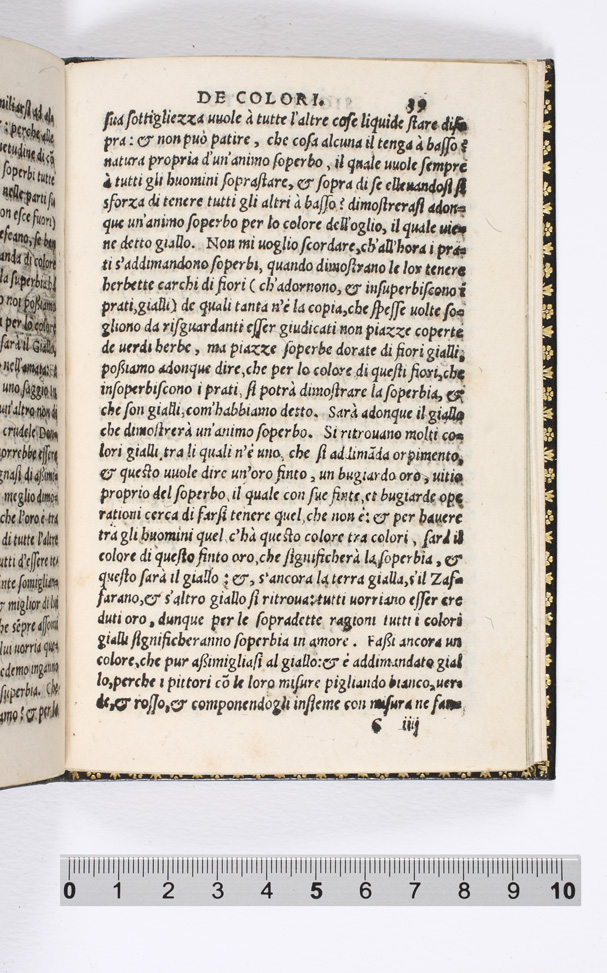 Il colore incarnato significa Amore. Cap. I. (p. 9-13); Il verde speranza. Cap. II. (p. 13-15); Il negro fede. Cap. III. (p. 15-18); Il bianco secreto. Cap. IIII. (p. 19-21); Turchino fermezza. Cap. V. (p. 22-24); Morello. Timore. Cap. VI. (p. 25-27); Berettino disperatione. Cap. VII. (p. 28-31); Rosso crudeltà. Cap. VIII. (p. 32-37); Giallo superbia. cap. VIIII. (p. 37-40); Verde sambugato uoglia di morire. Cap. X. (p. 41-43); Ranzato gelosia. Cap. XI. (p. 43-47); Meschio leggerezza. Cap. XII. (p. 47-50); Rosa secca amore finito. cap. XIII. (p. 50-54); Tanè, o leonato, tradimento, et inganno. Cap. XIIII. (p. 55-60) |