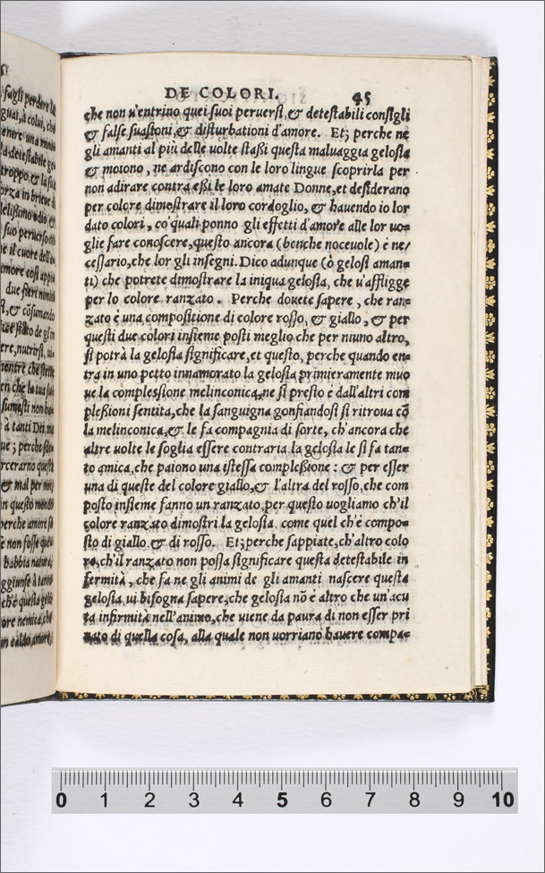 Il colore incarnato significa Amore. Cap. I. (p. 9-13); Il verde speranza. Cap. II. (p. 13-15); Il negro fede. Cap. III. (p. 15-18); Il bianco secreto. Cap. IIII. (p. 19-21); Turchino fermezza. Cap. V. (p. 22-24); Morello. Timore. Cap. VI. (p. 25-27); Berettino disperatione. Cap. VII. (p. 28-31); Rosso crudeltà. Cap. VIII. (p. 32-37); Giallo superbia. cap. VIIII. (p. 37-40); Verde sambugato uoglia di morire. Cap. X. (p. 41-43); Ranzato gelosia. Cap. XI. (p. 43-47); Meschio leggerezza. Cap. XII. (p. 47-50); Rosa secca amore finito. cap. XIII. (p. 50-54); Tanè, o leonato, tradimento, et inganno. Cap. XIIII. (p. 55-60) |