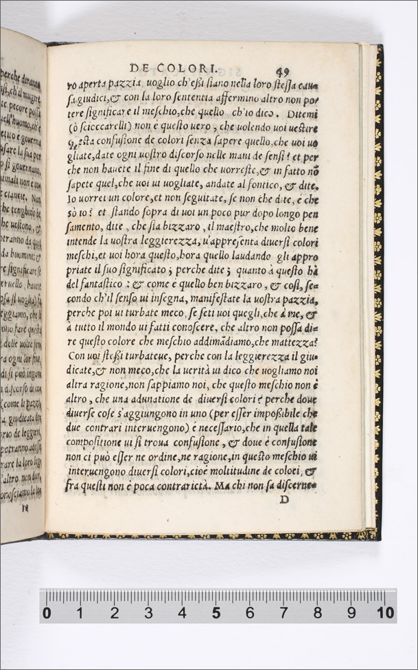 Il colore incarnato significa Amore. Cap. I. (p. 9-13); Il verde speranza. Cap. II. (p. 13-15); Il negro fede. Cap. III. (p. 15-18); Il bianco secreto. Cap. IIII. (p. 19-21); Turchino fermezza. Cap. V. (p. 22-24); Morello. Timore. Cap. VI. (p. 25-27); Berettino disperatione. Cap. VII. (p. 28-31); Rosso crudeltà. Cap. VIII. (p. 32-37); Giallo superbia. cap. VIIII. (p. 37-40); Verde sambugato uoglia di morire. Cap. X. (p. 41-43); Ranzato gelosia. Cap. XI. (p. 43-47); Meschio leggerezza. Cap. XII. (p. 47-50); Rosa secca amore finito. cap. XIII. (p. 50-54); Tanè, o leonato, tradimento, et inganno. Cap. XIIII. (p. 55-60) |