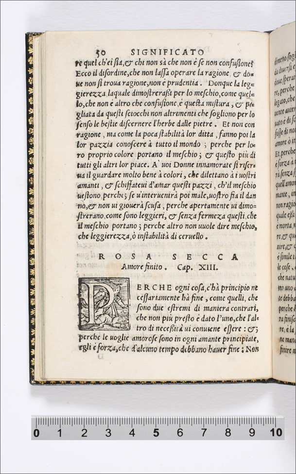 Il colore incarnato significa Amore. Cap. I. (p. 9-13); Il verde speranza. Cap. II. (p. 13-15); Il negro fede. Cap. III. (p. 15-18); Il bianco secreto. Cap. IIII. (p. 19-21); Turchino fermezza. Cap. V. (p. 22-24); Morello. Timore. Cap. VI. (p. 25-27); Berettino disperatione. Cap. VII. (p. 28-31); Rosso crudeltà. Cap. VIII. (p. 32-37); Giallo superbia. cap. VIIII. (p. 37-40); Verde sambugato uoglia di morire. Cap. X. (p. 41-43); Ranzato gelosia. Cap. XI. (p. 43-47); Meschio leggerezza. Cap. XII. (p. 47-50); Rosa secca amore finito. cap. XIII. (p. 50-54); Tanè, o leonato, tradimento, et inganno. Cap. XIIII. (p. 55-60) |