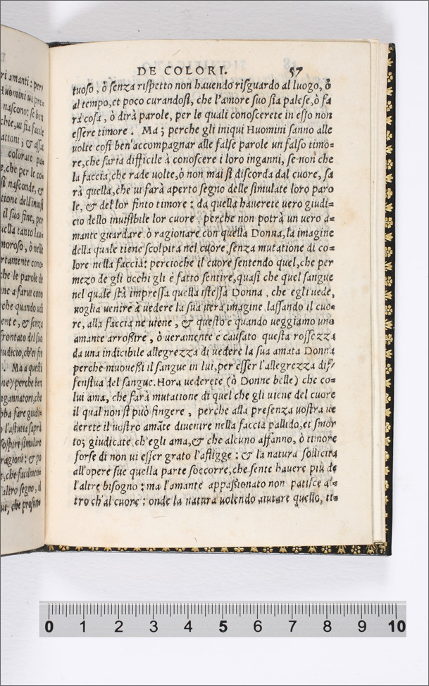 Il colore incarnato significa Amore. Cap. I. (p. 9-13); Il verde speranza. Cap. II. (p. 13-15); Il negro fede. Cap. III. (p. 15-18); Il bianco secreto. Cap. IIII. (p. 19-21); Turchino fermezza. Cap. V. (p. 22-24); Morello. Timore. Cap. VI. (p. 25-27); Berettino disperatione. Cap. VII. (p. 28-31); Rosso crudeltà. Cap. VIII. (p. 32-37); Giallo superbia. cap. VIIII. (p. 37-40); Verde sambugato uoglia di morire. Cap. X. (p. 41-43); Ranzato gelosia. Cap. XI. (p. 43-47); Meschio leggerezza. Cap. XII. (p. 47-50); Rosa secca amore finito. cap. XIII. (p. 50-54); Tanè, o leonato, tradimento, et inganno. Cap. XIIII. (p. 55-60) |