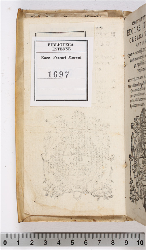 Questo esemplare delle Constitutiones è rilegato insieme a un'altra edizione in 12° di Paolo Gadaldini e fratelli, i Decreta prouincialis synodi Rauennatis .... (CNCE 37355). Si noti che questo vale per tutte e tre le copie delle Constitutiones possedute dalla Biblioteca Estense, anche se in un caso alle due cinquecentine si unisce un'edizione, sempre modenese, del secolo seguente e di argomento diverso (Il Proteo della corte di Bartolomeo Dionigi Guicciardi, stampato da Demetrio Degni nel 1683).