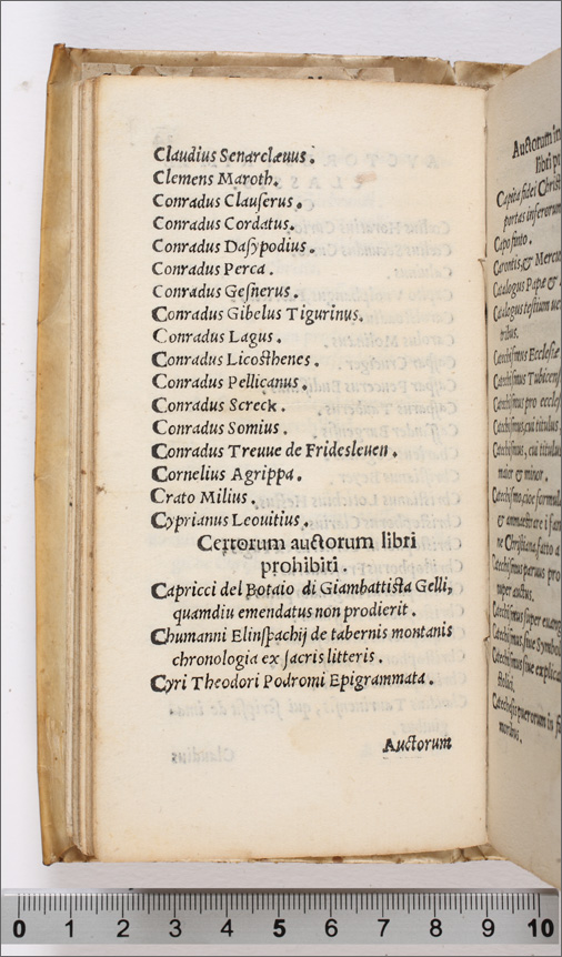 Index librorum prohinitorum, cum regulis confectis per patres à Tridentina synodo delectos, auctoritate sanctiss. D. N. Pii IIII, pont. max comprobatus (c. 19r--59r) |