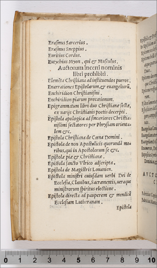 Index librorum prohinitorum, cum regulis confectis per patres à Tridentina synodo delectos, auctoritate sanctiss. D. N. Pii IIII, pont. max comprobatus (c. 19r--59r) |