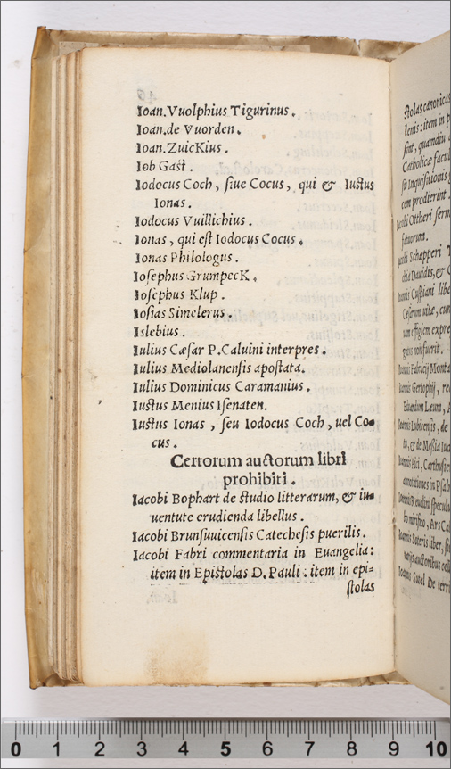 Index librorum prohinitorum, cum regulis confectis per patres à Tridentina synodo delectos, auctoritate sanctiss. D. N. Pii IIII, pont. max comprobatus (c. 19r--59r) |