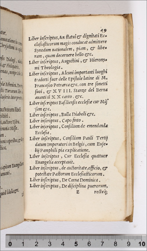 Index librorum prohinitorum, cum regulis confectis per patres à Tridentina synodo delectos, auctoritate sanctiss. D. N. Pii IIII, pont. max comprobatus (c. 19r--59r) |