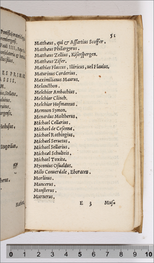 Index librorum prohinitorum, cum regulis confectis per patres à Tridentina synodo delectos, auctoritate sanctiss. D. N. Pii IIII, pont. max comprobatus (c. 19r--59r) |