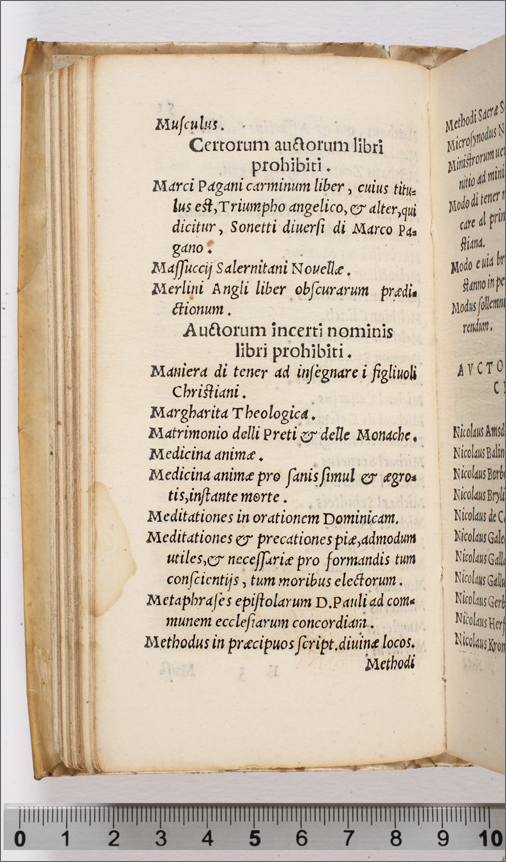 Index librorum prohinitorum, cum regulis confectis per patres à Tridentina synodo delectos, auctoritate sanctiss. D. N. Pii IIII, pont. max comprobatus (c. 19r--59r) |