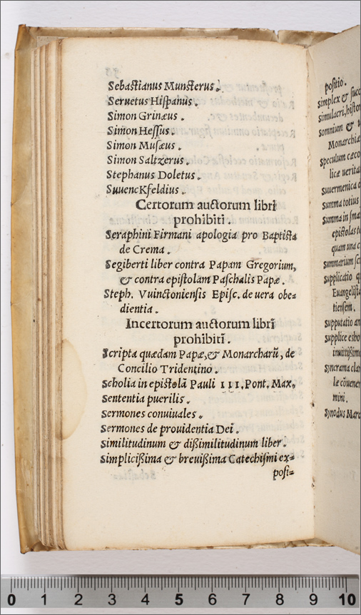 Index librorum prohinitorum, cum regulis confectis per patres à Tridentina synodo delectos, auctoritate sanctiss. D. N. Pii IIII, pont. max comprobatus (c. 19r--59r) |