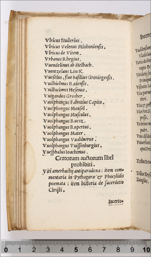Index librorum prohinitorum, cum regulis confectis per patres à Tridentina synodo delectos, auctoritate sanctiss. D. N. Pii IIII, pont. max comprobatus (c. 19r--59r) |