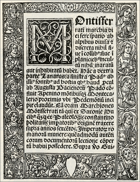 La coppia di sfingi sui lati di uno scudo, che figura al centro del legno inferiore nella nostra cornice, riprende uno schema molto diffuso su pagine e frontespizi nel primo secolo della stampa. L'esempio che segue è tratto dalla cornice che figura alla prima pagina di testo, c. [a]2r, in Montisferrati marchionum et principum regie propaginis ..., stampato a Asti da Francesco Selva nel 1519 (CNCE 31510; qui da Malaguzzi, fig. 273, p.305).