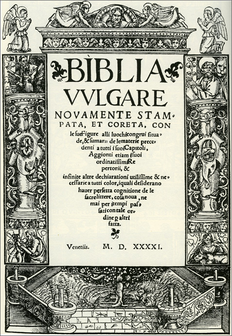 In vari casi inquadrano la prima pagina del testo o di una sua partizione (riprodotta sotto un'immagine dal Legendario de sancti stampato da N. e D. dal Gesù nel 1518 e tratta da Essling 1907-14, 1.2.1, p. 160). Una volta affermatosi il frontespizio, incorniceranno titolo e note tipografiche (sotto, da Essling 1907-14, 1.1, p. 158, quello della Biblia vulgare di B. Bindoni del 1541).