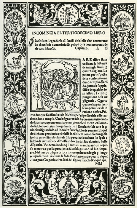 di Cornazano stampata da M. Bonelli nel 1495, come anche del frontespizio della Postilla super Epistolas et Euangelia di Guillermus Parisiensis stampata a Basilea da N. Kesler verso la fine del XV secolo, qui a destra, tratta