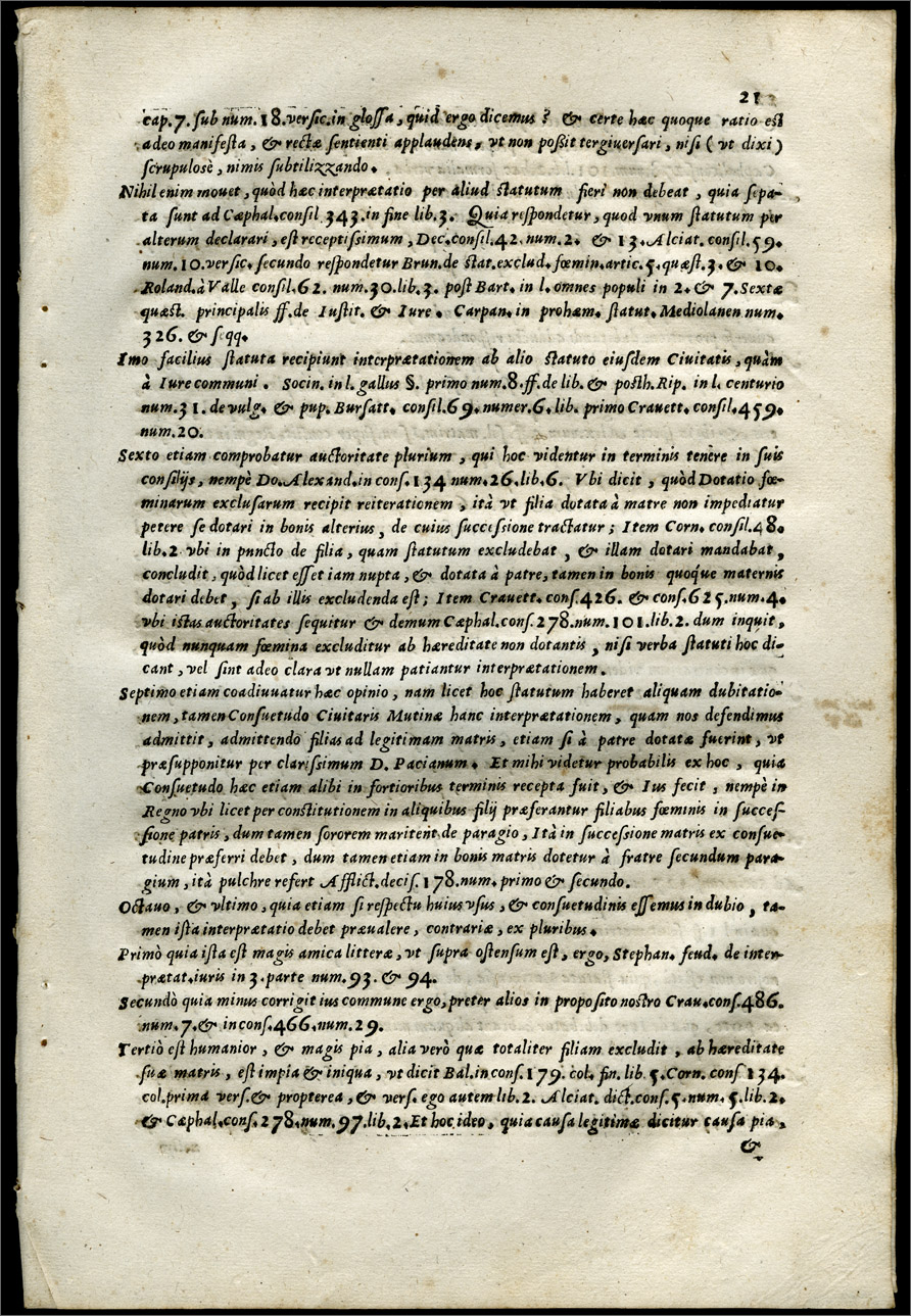 Responsa diuersorum super statutis Mutinae exclusiuis foeminarum, in quibus latissimè examinatur quaestio illa, an filiae exclusae à successione matris stantib. masculis debeatur dos de bonis maternis, non obstante quod fuerit à fratre dotata in bonis paternis, ante mortem matris / [Giovanni Pietro Sordi, Sforza degli Oddi, Giacomo Menochio]. - [Modena? : Francesco Gadaldini?], 1595.