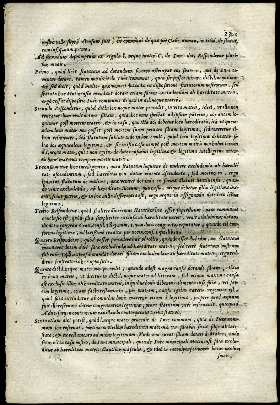 Responsa diuersorum super statutis Mutinae exclusiuis foeminarum, in quibus latissimè examinatur quaestio illa, an filiae exclusae à successione matris stantib. masculis debeatur dos de bonis maternis, non obstante quod fuerit à fratre dotata in bonis paternis, ante mortem matris / [Giovanni Pietro Sordi, Sforza degli Oddi, Giacomo Menochio]. - [Modena? : Francesco Gadaldini?], 1595.