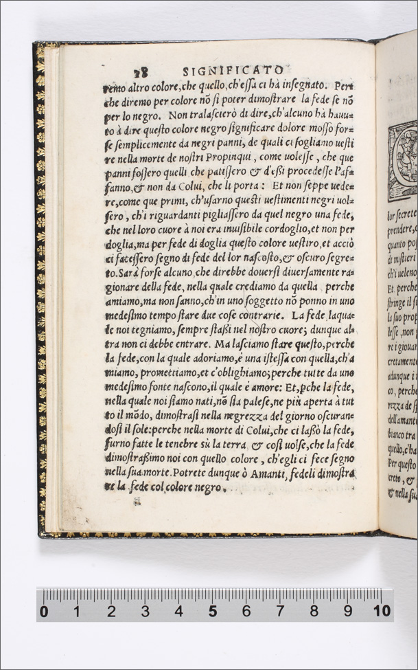 Il colore incarnato significa Amore. Cap. I. (p. 9-13); Il verde speranza. Cap. II. (p. 13-15); Il negro fede. Cap. III. (p. 15-18); Il bianco secreto. Cap. IIII. (p. 19-21); Turchino fermezza. Cap. V. (p. 22-24); Morello. Timore. Cap. VI. (p. 25-27); Berettino disperatione. Cap. VII. (p. 28-31); Rosso crudeltà. Cap. VIII. (p. 32-37); Giallo superbia. cap. VIIII. (p. 37-40); Verde sambugato uoglia di morire. Cap. X. (p. 41-43); Ranzato gelosia. Cap. XI. (p. 43-47); Meschio leggerezza. Cap. XII. (p. 47-50); Rosa secca amore finito. cap. XIII. (p. 50-54); Tanè, o leonato, tradimento, et inganno. Cap. XIIII. (p. 55-60) |