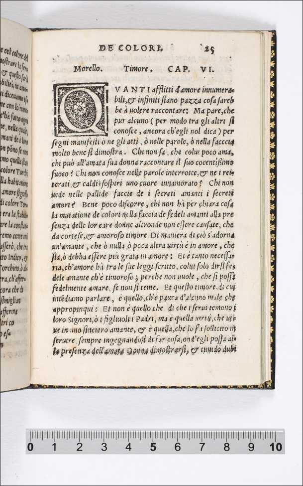 Il colore incarnato significa Amore. Cap. I. (p. 9-13); Il verde speranza. Cap. II. (p. 13-15); Il negro fede. Cap. III. (p. 15-18); Il bianco secreto. Cap. IIII. (p. 19-21); Turchino fermezza. Cap. V. (p. 22-24); Morello. Timore. Cap. VI. (p. 25-27); Berettino disperatione. Cap. VII. (p. 28-31); Rosso crudeltà. Cap. VIII. (p. 32-37); Giallo superbia. cap. VIIII. (p. 37-40); Verde sambugato uoglia di morire. Cap. X. (p. 41-43); Ranzato gelosia. Cap. XI. (p. 43-47); Meschio leggerezza. Cap. XII. (p. 47-50); Rosa secca amore finito. cap. XIII. (p. 50-54); Tanè, o leonato, tradimento, et inganno. Cap. XIIII. (p. 55-60) |