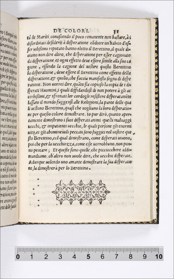 Il colore incarnato significa Amore. Cap. I. (p. 9-13); Il verde speranza. Cap. II. (p. 13-15); Il negro fede. Cap. III. (p. 15-18); Il bianco secreto. Cap. IIII. (p. 19-21); Turchino fermezza. Cap. V. (p. 22-24); Morello. Timore. Cap. VI. (p. 25-27); Berettino disperatione. Cap. VII. (p. 28-31); Rosso crudeltà. Cap. VIII. (p. 32-37); Giallo superbia. cap. VIIII. (p. 37-40); Verde sambugato uoglia di morire. Cap. X. (p. 41-43); Ranzato gelosia. Cap. XI. (p. 43-47); Meschio leggerezza. Cap. XII. (p. 47-50); Rosa secca amore finito. cap. XIII. (p. 50-54); Tanè, o leonato, tradimento, et inganno. Cap. XIIII. (p. 55-60) |