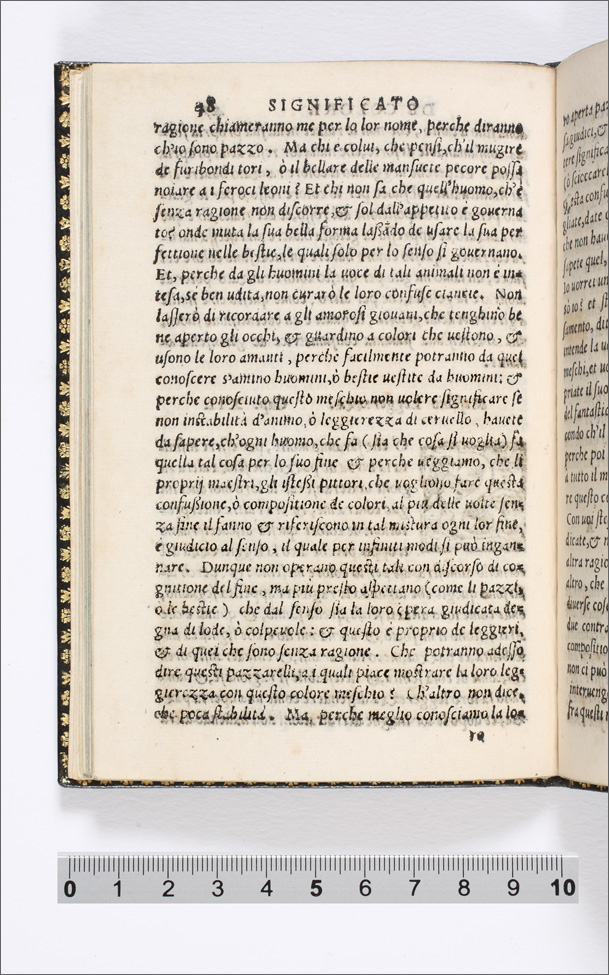 punto beige Il colore incarnato significa Amore. Cap. I. (p. 9-13); Il verde speranza. Cap. II. (p. 13-15); Il negro fede. Cap. III. (p. 15-18); Il bianco secreto. Cap. IIII. (p. 19-21); Turchino fermezza. Cap. V. (p. 22-24); Morello. Timore. Cap. VI. (p. 25-27); Berettino disperatione. Cap. VII. (p. 28-31); Rosso crudeltà. Cap. VIII. (p. 32-37); Giallo superbia. cap. VIIII. (p. 37-40); Verde sambugato uoglia di morire. Cap. X. (p. 41-43); Ranzato gelosia. Cap. XI. (p. 43-47); Meschio leggerezza. Cap. XII. (p. 47-50); Rosa secca amore finito. cap. XIII. (p. 50-54); Tanè, o leonato, tradimento, et inganno. Cap. XIIII. (p. 55-60)