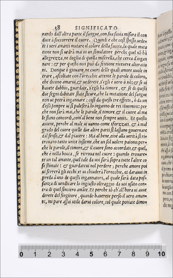 Il colore incarnato significa Amore. Cap. I. (p. 9-13); Il verde speranza. Cap. II. (p. 13-15); Il negro fede. Cap. III. (p. 15-18); Il bianco secreto. Cap. IIII. (p. 19-21); Turchino fermezza. Cap. V. (p. 22-24); Morello. Timore. Cap. VI. (p. 25-27); Berettino disperatione. Cap. VII. (p. 28-31); Rosso crudeltà. Cap. VIII. (p. 32-37); Giallo superbia. cap. VIIII. (p. 37-40); Verde sambugato uoglia di morire. Cap. X. (p. 41-43); Ranzato gelosia. Cap. XI. (p. 43-47); Meschio leggerezza. Cap. XII. (p. 47-50); Rosa secca amore finito. cap. XIII. (p. 50-54); Tanè, o leonato, tradimento, et inganno. Cap. XIIII. (p. 55-60) |
