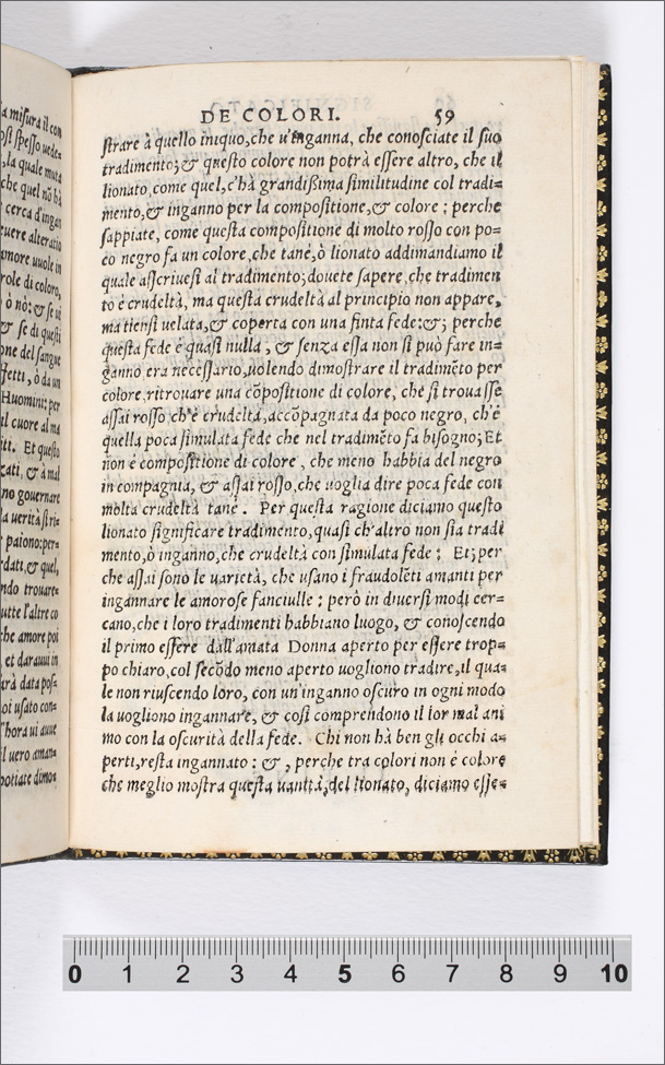 Il colore incarnato significa Amore. Cap. I. (p. 9-13); Il verde speranza. Cap. II. (p. 13-15); Il negro fede. Cap. III. (p. 15-18); Il bianco secreto. Cap. IIII. (p. 19-21); Turchino fermezza. Cap. V. (p. 22-24); Morello. Timore. Cap. VI. (p. 25-27); Berettino disperatione. Cap. VII. (p. 28-31); Rosso crudeltà. Cap. VIII. (p. 32-37); Giallo superbia. cap. VIIII. (p. 37-40); Verde sambugato uoglia di morire. Cap. X. (p. 41-43); Ranzato gelosia. Cap. XI. (p. 43-47); Meschio leggerezza. Cap. XII. (p. 47-50); Rosa secca amore finito. cap. XIII. (p. 50-54); Tanè, o leonato, tradimento, et inganno. Cap. XIIII. (p. 55-60) |