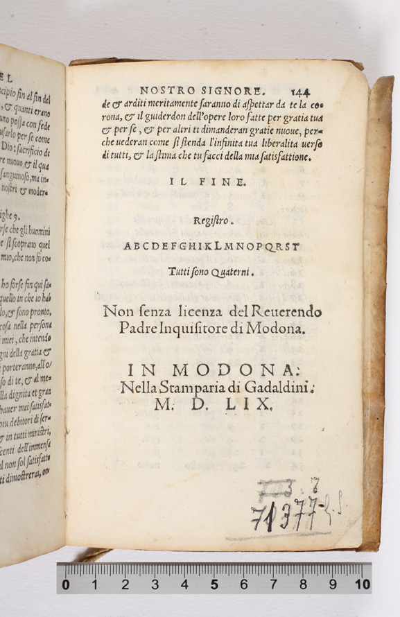 punto beige Registro, citazione della licenza del Sant'Ufficio e colophon (c. 144r)