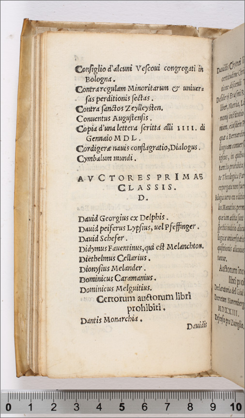Index librorum prohinitorum, cum regulis confectis per patres à Tridentina synodo delectos, auctoritate sanctiss. D. N. Pii IIII, pont. max comprobatus (c. 19r--59r) |