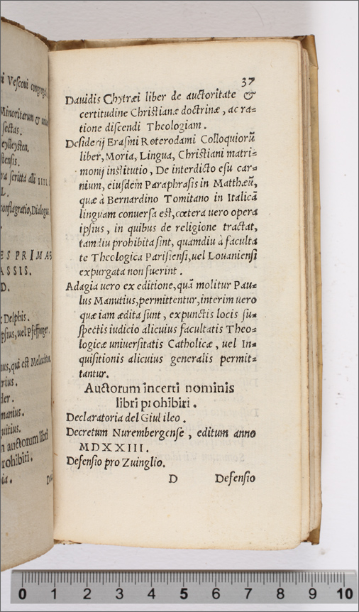 Index librorum prohinitorum, cum regulis confectis per patres à Tridentina synodo delectos, auctoritate sanctiss. D. N. Pii IIII, pont. max comprobatus (c. 19r--59r) |