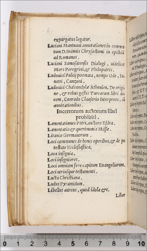 Index librorum prohinitorum, cum regulis confectis per patres à Tridentina synodo delectos, auctoritate sanctiss. D. N. Pii IIII, pont. max comprobatus (c. 19r--59r) |