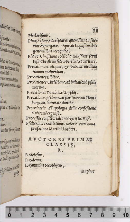 Index librorum prohinitorum, cum regulis confectis per patres à Tridentina synodo delectos, auctoritate sanctiss. D. N. Pii IIII, pont. max comprobatus (c. 19r--59r) |