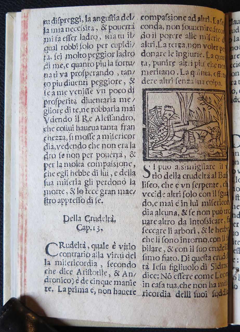 Si può assimigliare il vitio della crudeltà al Basilisco, che è un serpente, che uccide altri solo con il sguardo, e mai è in lui misericordia alcuna, & se non può trovare altro da intossicare, fa seccare li arbori, &